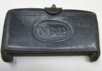 Original era manufacture. All black leather construction, with two rows of 10 canvas loops for 45-70 cartridges. An early pattern pouch without the brass escutcheon plate on the securing strap.Very clear NGP in an oval on the front side of the pouch. Crazed leather surface with a nice luster. J. H. Wilson mfg. Of interest is this is a commercially made, rather than a US Arsenal. Possibly James H. Wilson of Philadelphia, 1106 Chestnut Street 1874-1885, listed as a dealer of military goods, also of regalia. Normal age and wear.