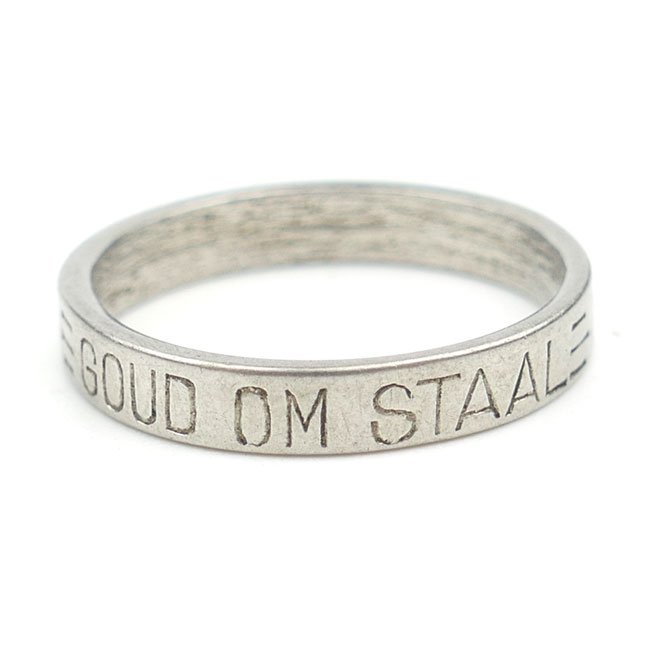 NSB 'Goud om Staal = NSB 1940' Ring. The Dutch 'Nationaal-Socialistische Beweging' (National Socialist Movement) was founded by 'Anton Mussert' in December 1931 and was a Dutch pro-German Nazi Party. In order to raise funds for the party, the NSB launched the 'gold for steel' campaign in January 1940. Members were able to hand in precious metals for which they received a steel ring with inscription as a thank you. For some, the loyalty to the party went so far as to hand in their wedding rings. The ring is hving a diameter of 22mm. Decorative original ring.