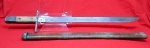 Original era manufacture. Square pommel, straight guard, no contour wooden grips with an even steel patina finished, later pattern blade without fullers, rather crude in construction with file marks visible. Clear Jinsen arsenel proof on the ricasso, with a general unfinished look to the blade surface, typical for this late pattern bayonet. The grips are unfinished with light denting and marring from age and use. The two piece wooden scabbard shows a simple lacquered finish with a squared off tip. It is bound in two places and has a metal scabbard loop at the throat. No throat screw (sometimes these were produced without them) with a thin crack in the scabbard body. Scarce late pattern bayonet.
