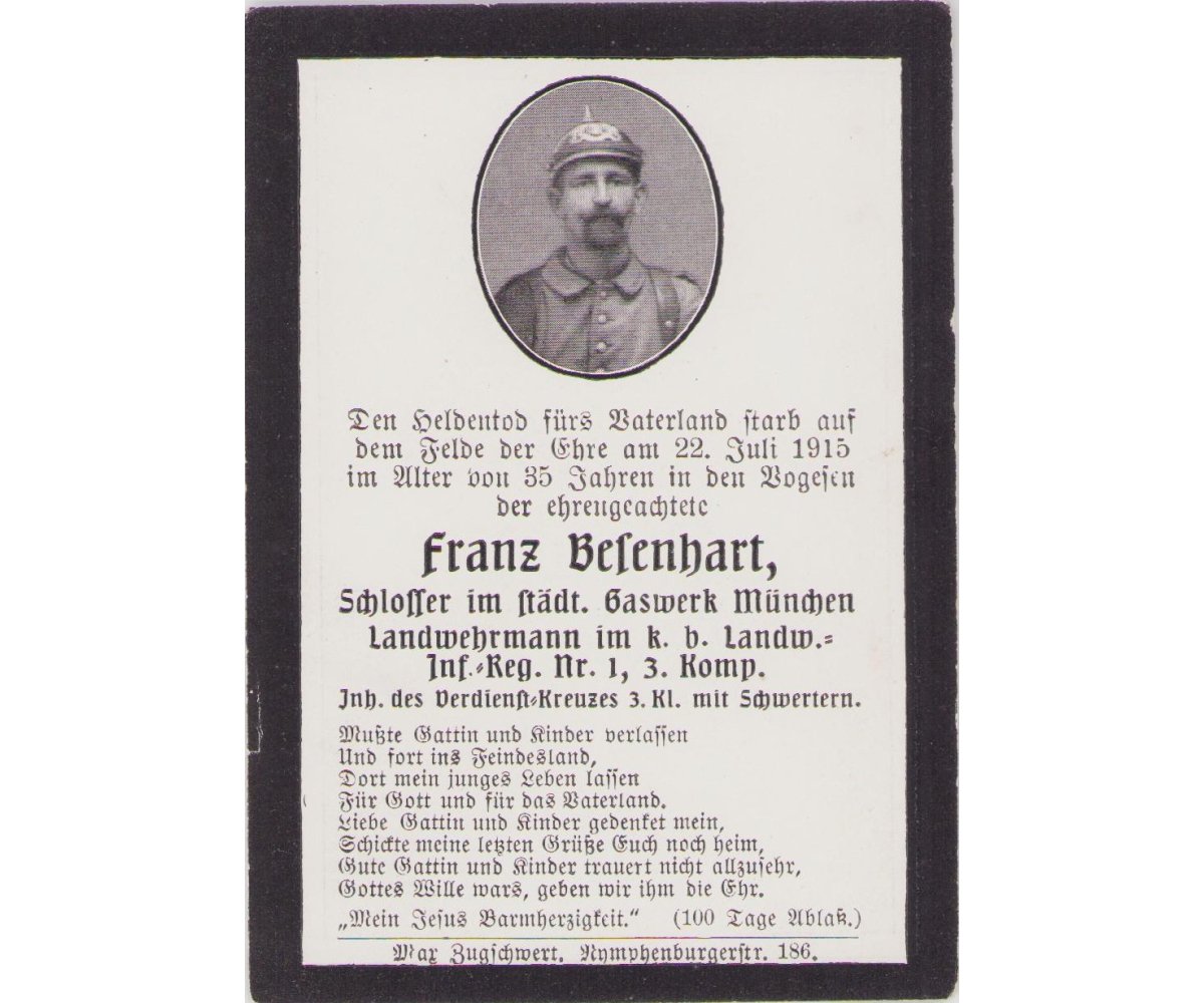 Death notice of Franz Besenhart who died during combat in the Vogese mountains in 1915.
