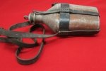 Original era manufacture An early aluminum bodied canteen developed under the reign of Emperor Meiji and issued with minor changes, canvas instead of leather suspension into the early 1930s. Cylindrical canteen body with a brown painted finish. The leather suspension harness and strap are dry but sound, the cork bodied metal stopper is present but the attaching strap, while full length, is broken.
