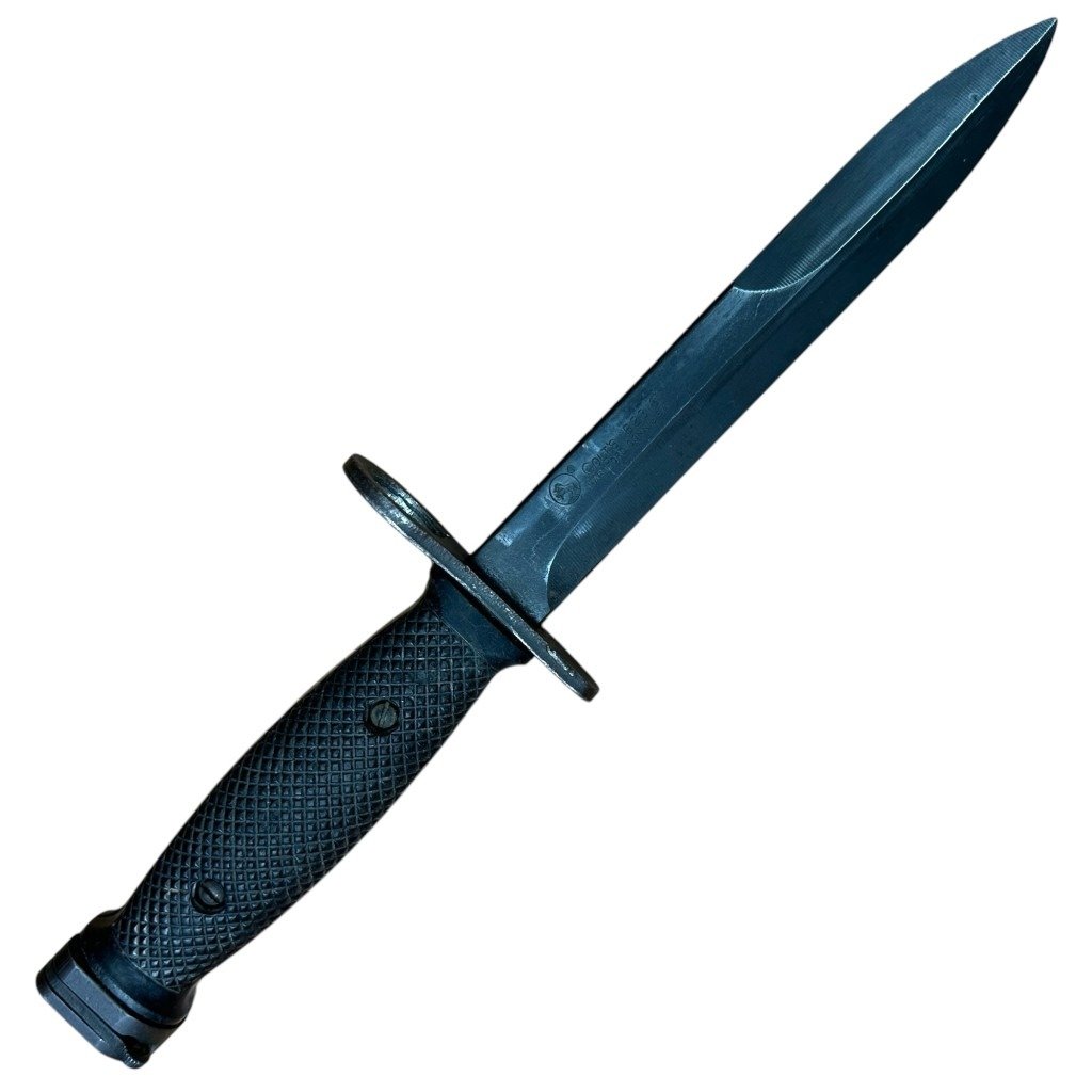 This US M7 bayonet, produced by the manufacturer Colt, is an iconic military bayonet originating from the Vietnam War era.Designed to be used on the M16 assault rifle, this bayonet embodies the durability and versatility characteristic of military equipment from that period.An iconic object for the militaria or Vietnam War collection!The American M7 BayonetThe M7 bayonet, an iconic weapon accessory from the 1960s, played an important role during the Vietnam War. It was a versatile tool for American soldiers, serving both as a knife and as a bayonet that could be mounted on the M16 rifle. The M7 not only became a symbol of American military equipment during this conflict but also represented the technological advancements and the practical approach that was applied in the military at the time.The Origins of the M7 BayonetThe M7 bayonet was introduced in 1964 as the standard weapon accessory for the M16 rifle, which replaced the M14 in U.S. military units. The M7 was designed as a versatile tool that could be used both as a stabbing weapon and as a knife. The M16, developed in the early 1960s, was a lightweight and relatively advanced weapon, and the bayonet needed to align with the modern approach to military equipment. The M7 was designed to be practical, lightweight, and effective.Design and FeaturesThe M7 had several design features that made it suitable for the challenging conditions of the Vietnam War. The length of the bayonet was 29.8 cm (11.75 inches).The M7 bayonet came originally with an M8A1 scabbard.The blade was capable of both cutting and sawing, which was handy for various practical purposes, such as cutting ropes, chopping branches, or even digging a shelter. The blade was made of steel and coated with a black finish that made it resistant to rust and corrosion, which was crucial in the humid climate of Vietnam.The grip of the M7 was designed with either a wooden or plastic handle that provided good control, even under harsh conditions. At the back of the handle was a metal pommel, which could be used for striking, giving the knife an additional function besides being a stabbing weapon.What made the M7 truly unique was its ability to be mounted as a bayonet on the M16 rifle. This gave soldiers the option to quickly transition from a firefight to hand-to-hand combat, with the M7 easily attached to the rifle, turning it into a powerful stabbing weapon.ManufacturersColt (manufacturer of the M16)Ontario Knife CompanyCarl Eickhorn [for Colt]Columbus Milpar & Mfg. (MIL-PAR)Conetta Mfg.Eight Dollar Mountain Foundry (EDMF)Frazier Mfg.General Cutlery (GEN CUT)Imperial KnifeBauer Ord CompanyThe Use of the M7 During the Vietnam WarDuring the Vietnam War, the M7 bayonet was an indispensable part of American soldiers' equipment. It was used in various situations, from fighting in dense terrain to protecting the soldier from surprise attacks. The many functions of the knife – from a combat weapon to a tool for everyday tasks – made it a beloved piece of gear among U.S. troops.The M7 bayonet was also often associated with the brutal and intense nature of the war in Vietnam. In the dirty and unpredictable jungle conditions, where close-quarter combat was common, the bayonet became a necessary tool for soldiers. It not only offered a practical solution for close-quarters combat but was also used during moments of military stress, when soldiers often literally held their weapons in life-or-death battles.Although the use of the M7 in combat was not as frequent as the use of firearms, the knife was often seen as a last resort, a symbol of the intensity of the fight. Additionally, the knife was used for other purposes, such as manually cutting through obstacles or defending against animals that sometimes posed a threat in the dense jungles.The M7 Bayonet After the Vietnam WarAfter the Vietnam War, the M7 bayonet remained standard issue for the U.S. military, though it was eventually replaced by other models and weapons systems. However, the M7 was such an iconic symbol of the Vietnam War that it remains a beloved collectible for military historians and collectors of military memorabilia.Today, the M7 is seen as a piece of history, a reminder of the soldiers who fought in the Vietnam War and the role the knife played during those tough times. Even though it lost its role as the standard bayonet in the U.S. military, it remains an essential part of 20th-century military equipment.
