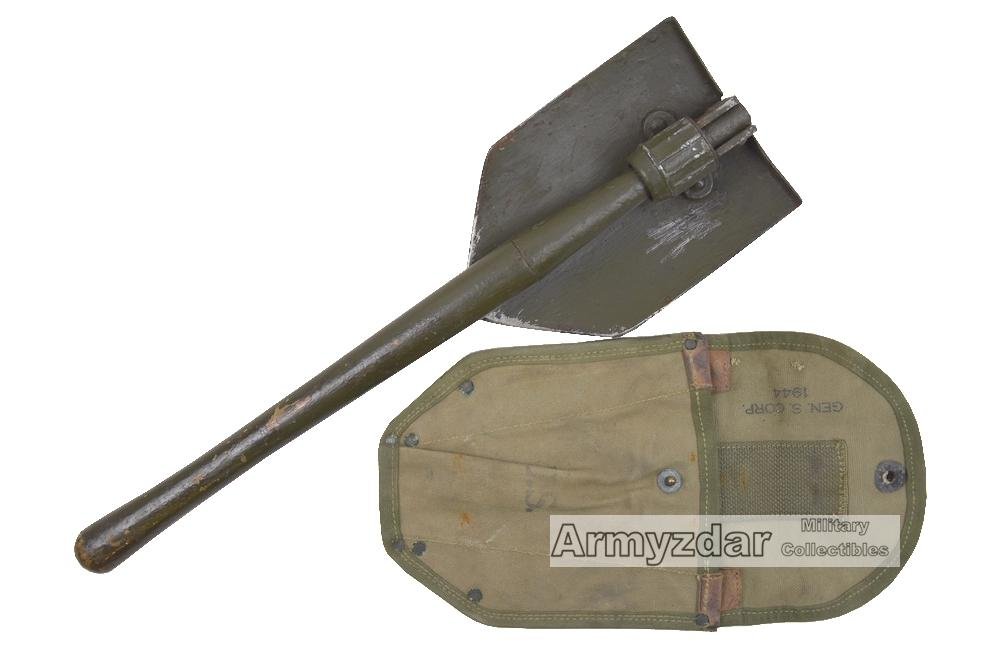 This is a nice used WW2 shovel with its canvas cover. The carrier is marked marked 1944, the shovel US and maker marked.