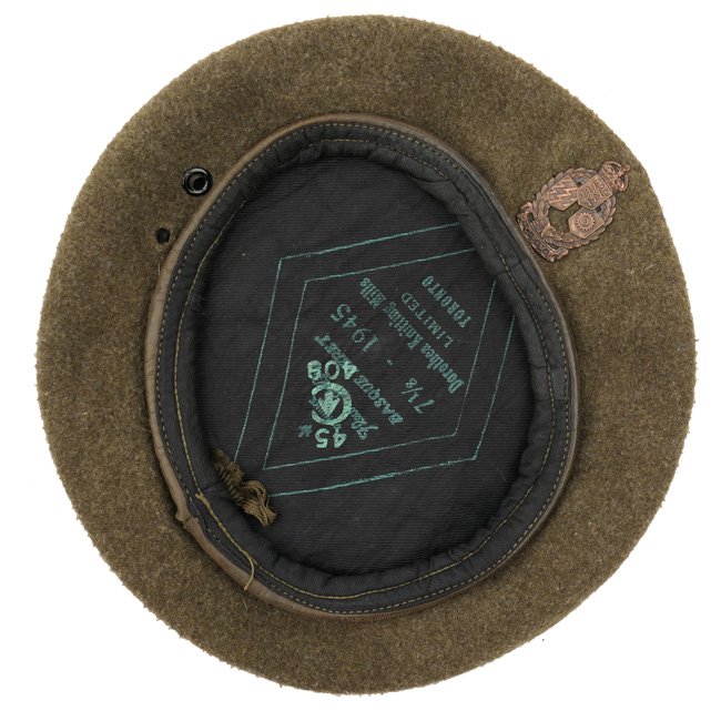 Canadian Khaki Beret. The Canadian Khaki Beret was introduced in 1943. The beret was worn slightly tilted to the left, the insignia had to be worn directly above the left eye. The beret is nicely maker marked by the 'Dorothea Knitting Mills Limited' from Toronto and dated 1945. The size of the cap is '7⅛'. The bertet is complete with an original RCEME (Royal Canadian Electrical and Mechanical Engineers) Cap Badge. Nice original beret in very good condition!