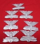 Original era manufacture. Lot of 7 stamped aluminum insignia, each measuring 40 x 27 mm. Each depicts an eagle clutching a rifle in its claws, pierced in three places for sewing to a uniform. Evidently these were worn as pairs as one of them faces left, the reminder face right.