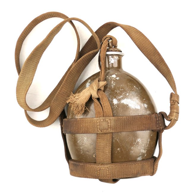 World War 2 Japanese Canteen & Carrier. This is a Type 99 aluminum canteen with cork, complete in webbin carrying harness. The soldier's name is painted on the canteen. The harness is damaged/repaired at one side, see photos. Nice original WW2 Japanese canteen in good used condition!