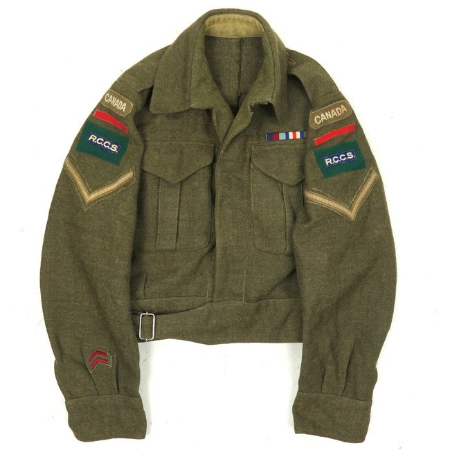 4th Canadian Armoured Division 'Royal Canadian Corps of Signals' (RCCS) Battle Dress Jacket. The Canadian made Battledress was made according to the British 1937 Pattern. The Battledress was the standard uniform for all Army Personnel, officers and other ranks in the theatres of operations. The markings are fainted, the jacket is also marked with a Canadian 'broad-arrow' marking. The jacket has been tailor converted into an open V-style collar. The jacket is complete with original period machine-sewn 'R.C.C.S.' shoulder titles, Canada patches, brigade bars for the 2nd brigade, 4th Canadian Armoured Division patches and lance corporal chevrons. Nice original RCCS Batte Dress Tunic!
