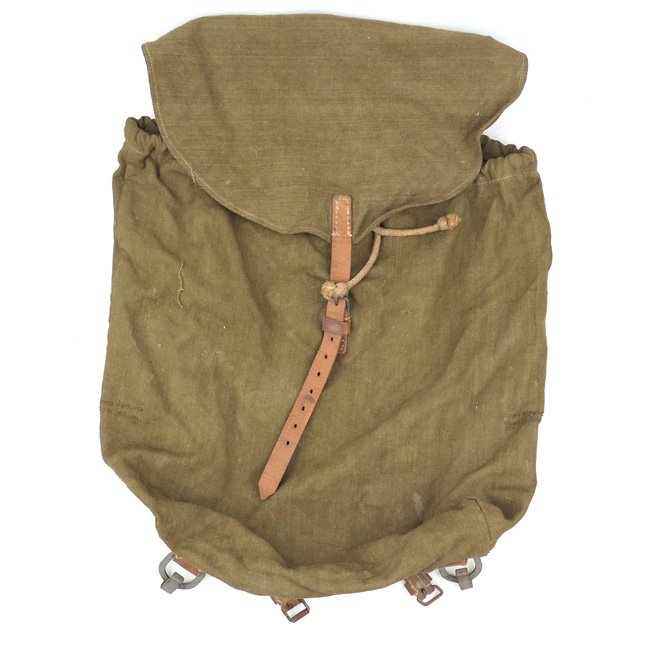 Wehrmacht (Heer) Combat Rucksack (Rucksack). During the war the early M34 and M39 Affe backpacks were found to be too expensive and time consuming to produce which resulted in the production of a wide variety of less expensive canvas construction combat rucksacks and backpacks. This is a late-war rucksack, executed in green, 'heavy-duty' cotton and has a rounded fold over top flap. There is an affixed inner-pouch made of cotton, intended to hold some private items, like towels etc. The rucksack is having leather carrying straps, made of recycled materials. The rucksack is not visible maker marked or dated. Nice original late-war rucksack in good used condition!