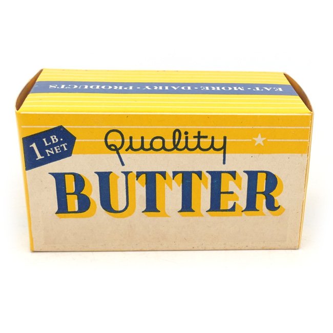 World War 2 period carton US 'Butter' Ration Package. The carton box would contain one pound of butter. The carton package has been prodcued by the 'Sutherland Paper Co.' from Kalamazoo, Mich. and is marked with a 1940 dated Copyright. The waxed paper carton box is sized approximately 12,5 x 7 x 7 cms. This would be a great item to add to a US diorama or personal display. Nice and hard to find original wartime food ration package!