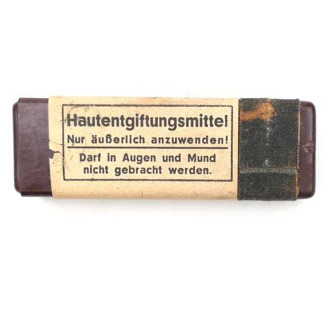 Original bakelite box for skin detoxification (Hautentgiftungsmittel). Next to the Gasmask as a protective device, german soldiers were issued with skin and weapon decontaminants. One of the skin decontaminants was 'Losantin' (introduced in 1935). These were issued in a brown bakelite box which contained 10 tablets. It was used to detoxificate the skin after a (mustard) gas attack (Senfgas). The box is approximately sized 7,7 x 2,6 x 1,5 cms. The box is complete with its original contents (10 tablets), its original label and still closed with the black tape which indicates production in 1941, the bakelite box is maker marked and dated 1941. These bakelite boxes are often empty and missing their labels, hard to find example in very good condition!