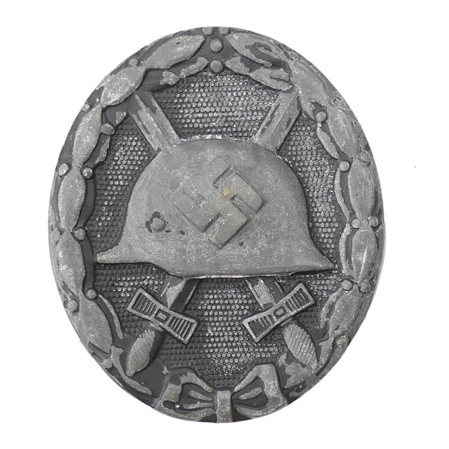 Wound Badge in Black (Verwundeten Abzeichen in Schwarz). With the outbreak of World War 2, on 1 September 1939, Hitler re-instituted a slightly modified version of the wound badge by altering the WWI pattern helmet on the badge to the newly designed M35 style helmet. The badge was awarded to both military and uniformed non-military personnel and later, (March 1943), to civilian personnel who received wounds as a result of enemy actions. The black wound badge was the lowest of the three classes and was awarded for one or two wounds. The badge is a non-magnetic zinc example. The badge is not visible maker marked. The pin and catch are complete and functional. Hard to find original zinc-type badge in used condition!