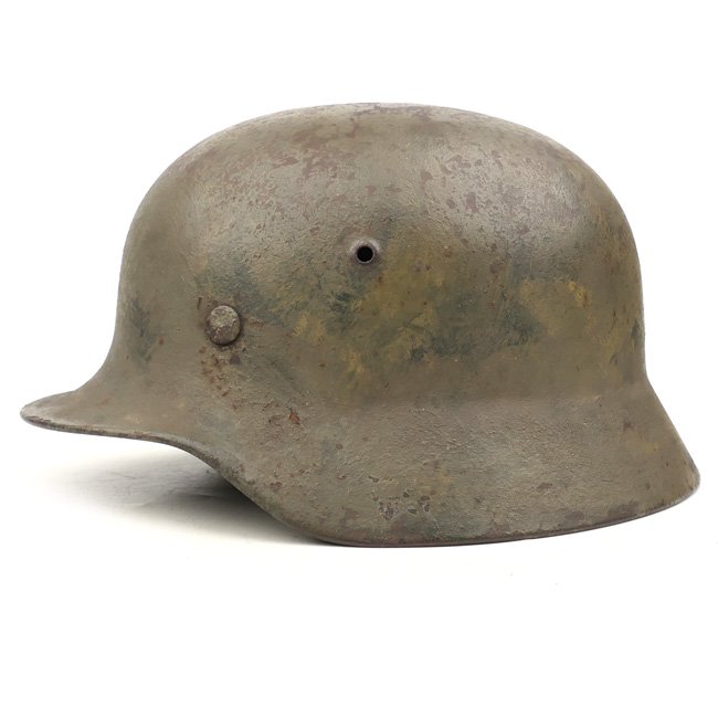 WH (Heer) or Kriegsmarine/SS M35 Single Decal Camouflaged Combat Helmet (Stahlhelm M35). The steel construction reissued M35 helmet retains most of its rough textured (field-applied) various shades of fieldgrey/grey camouflage over-paint. I could not find any decals visible beneath the thick paint. The paint shows normal wear and scratches, see photos. All three liner retaining rivets are intact. The interior of the helmet is a M31 leather liner with eight fingers and a steel liner ring. The liner might have been replaced or taken out long time ago. The leather is showing clear traces of age, see photos. The liner is complet with its original drawstring. The shell is marked with maker and size 'Q64' which indicates production by the company of 'F.W. Quist, G.m.b.H.' from Esslingen. The reverse interior neck guard apron has a stamped serial number '1138', this lot number is known to have been issued to the SS as well, various helmets from this lot are known with SS decals. Due to the thick camouflage overpaint it is hard to tell if this helmet started life as an SS helmet or not, or if it might have been reissued to a Heeres or Kriegsmarine Naval or Coastal Artillery (Küstenartillerie) unit. The grey shades in this camouflage however would look great on any SS or Naval set-up. Overall a nice original camouflage helmet for a fair price!