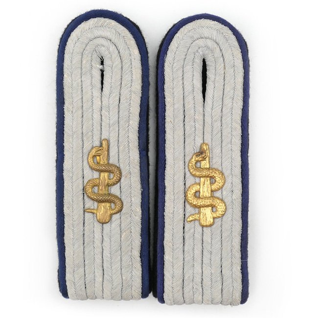 Waffen-SS Medical Untersturmführer's Shoulder Boards (Schulterstücke). The boards, which are constructed from black coloured 'smooth' type wool piped in blue as intended for a Waffen-SS medical (Sanitäts) Officer in the rank of 'Untersturmführer'. The boards are of the slip-on type and measure approximately 11cms in length. The cyphers are slightly mismatched but the pair was found as such and is clearly a matching pair and it is still visible how they have been tied together for many years. Nice original pair of Waffen-SS officer's shoulder-boards in very good condition!