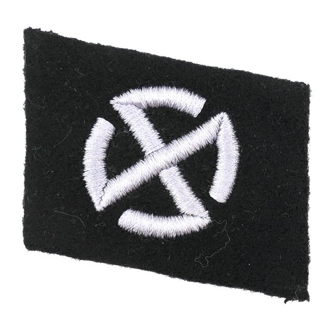 Waffen-SS Collar Tab (Kragenspiegel) as intended for a member within the '11. SS-Freiwilligen-Panzer-Grenadier-Division 'Nordland'. The 11. SS-Freiwilligen-Panzergrenadier-Division Nordland was a Waffen-SS division that was founded in July 1943. The division fought in Poland, Croatia and the Battle of Berlin at the end of the war. In May 1945 the division surrendered to the Americans at the Elbe. The division's emblem was a rounded swastika in a circle as shown on the distinctive collar tab. The collar tab is machine embroidered in silver-grey thread on black wool, the collar tab is having a nice 'Buckram' backing. The collar-tab originates almost certainly from the SS clothing department at the Dachau KZ when liberated in 1945. Nice original collar tab in very good condition!