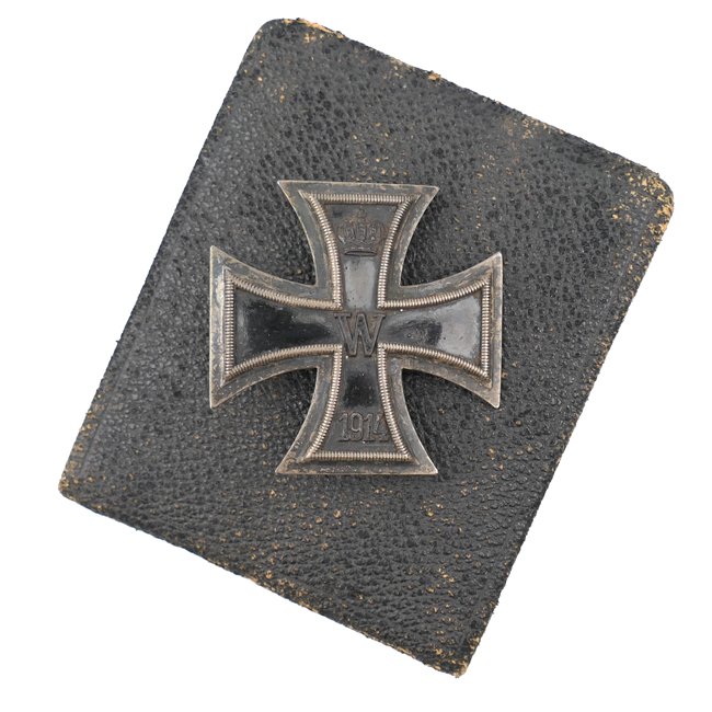 World War 1 Iron Cross 1st Class (Eisernes Kreuz 1. Klasse), complete with its original etui. Re-instituted by King Wilhelm II on 5 August 1914 for award during WWI. Both the Iron Cross 1st Class and the Iron Cross 2nd Class were awarded without regard to rank. The second class medal was for award to personnel who performed a single act of bravery in combat. One had to already possess the 2nd Class in order to receive the 1st Class. The cross has a three piece construction with an iron core and a silver frame. The cross is maker marked 'KMST' indicating production by the 'Königlichen Münze' from Stuttgart and also showing a 'DRGM' trade mark. The pin and catch are in functional condition, the pin is showing an '800' silver hallmark. The cross comes in an original privately purchase type case as found together. The case was originally inteded for a 2nd class cross in my opinion but looking at the imprints you can see this cross has always been in this case so I decided to keep them together as found. Rare original cased 'KMST' WW1 Iron Cross 1st Class!