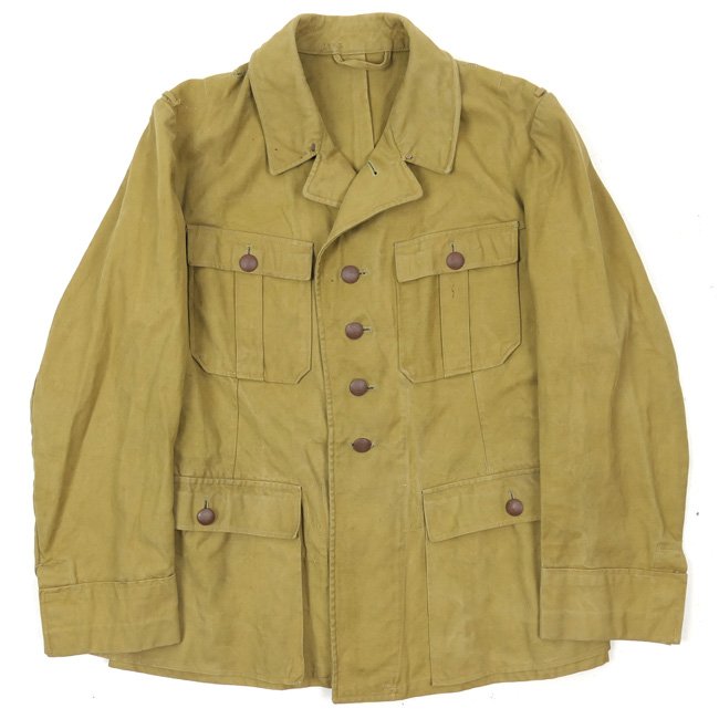 Luftwaffe Tropical Tunic (Tropenfeldbluse). In late 1940, with the impending German entrance into the North African campaign, tropical uniforms and equipment were quickly developed and issued in time for DAK personnel's arrival in Tripoli in February 1941. Originally the tropical uniforms were only intended for wear in North Africa but that was later expanded to include personnel serving in southern areas of continental Europe during the summer months. The light weight tan cotton construction field blouse has no insignia attached. The tunic is complete with all brown painted pebbled buttons and glass type buttons at the sleeve ends. The tunic is nicely maker marked by the company 'Hermann Frank' from Berlin, there are various size markings (chest size 98cms). The tunic is in very good slightly used condition, a name 'Lenz' is written inside the tunic. Nice and rare original Luftwaffe Tropical Tunic!