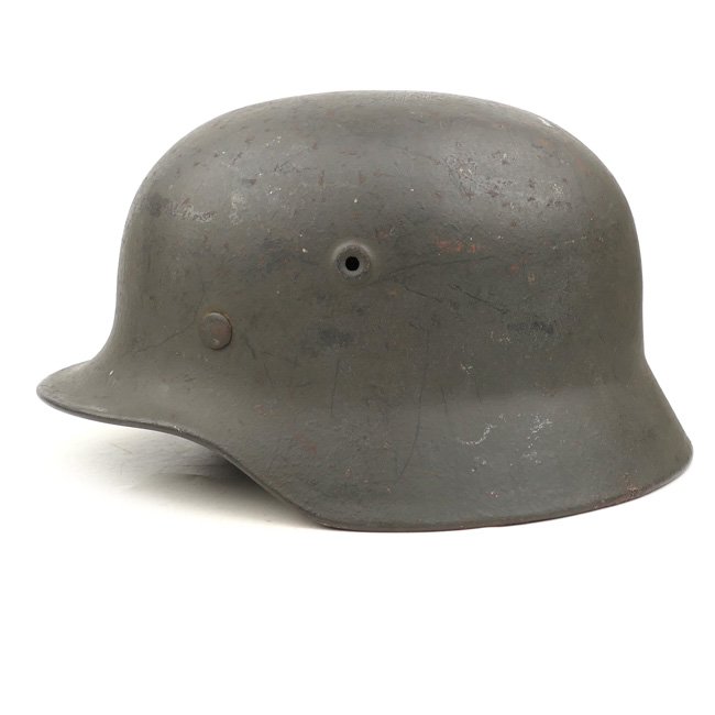 Wehrmacht (Heer) M40 No Decal Combat Helmet (Stahlhelm M40). The stamped sheet steel construction M40 helmet retains most of its rough textured, field-grey paint. The paint shows normal wear and scratches caused by usage, see photos. All three liner retaining rivets are intact. The interior of the helmet is a M31 leather liner with all eight fingers intact. The liner is complete with its original liner cord, the cord has been ripped out a few of the fingers, see photos, the leather is very supple. The metal liner ring looks to be dated 1943 but it is hard to see. The shell is marked with maker and size 'Q66'. 'Q' is indicating production by the 'F.W. Quist, G.m.b.H.' in Esslingen. The reverse interior neck guard apron has a stamped lot-number 'S342c'. The Quist company kept producing the M40 helmet shell right up till late in 1944 whilst the other companies all adopted the M42 model. This helmet was made for all the branches just like the M42 helmet without decal. The liner shows a written name indicating that this helmet was issued to an Army Officer 'Oberleutnant Lippert'. The helmet is in original untouched and uncleaned condition as found. Nice and honest original mid to late war M40 combat helmet in good condition!