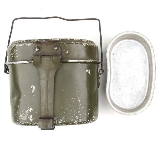 Wehrmacht Mess Kit M31 (Kochgeschirr 31). The 'Kochgeschirr 31' was introduced on 23 March 1931. This is a nice original late war aluminum and steel construction mess kit. The mess kit is maker marked with 'MN45' indicating production in 1945. It is complete with the rarely seen inner compartment, only found in late war 1945 dated mess kits, sometimes called M45 model. The mess kit still retains almost all of its original darker olive-green paint. The mess kit is in uncleaned condition as found. Rare original example in good used condition!