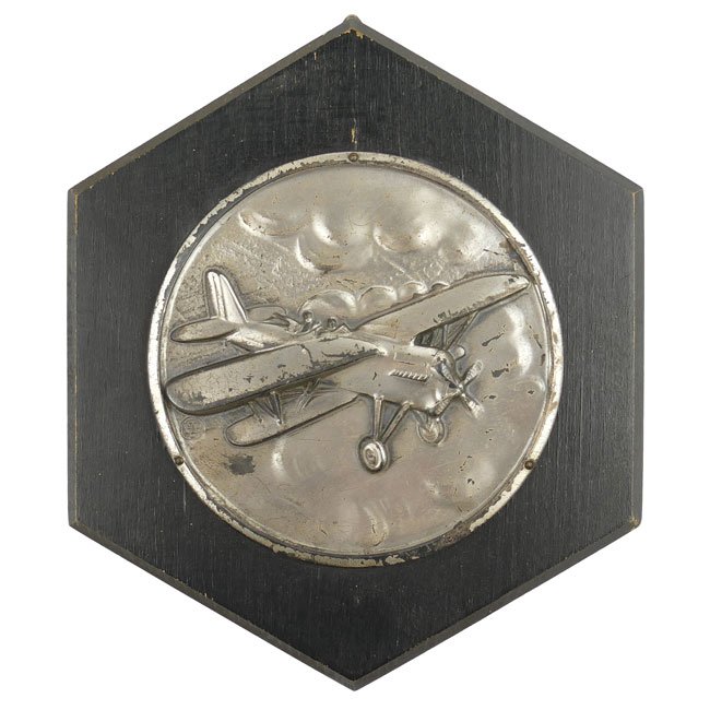 Luftwaffe Souvenir Wall Plaque, placed on a wooden background (Wandplakette). The plaque is showing a WW1 type fighter plane, the plaque is maker marked with 'HB'. The plaque was given as a Birthday present to a member within the 'Uffz.Korps, Jagdstaffel 1, I, 135 Bad-Aibling' on 9 July 1937. The detailed plaque is placed on a wooden base, sized approximately 17 x 20 cms. It is complete with a metal eyelet to hang it on the wall. Nice and decorative original item!
