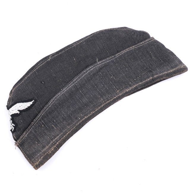 Luftwaffe EM/NCO's Panzer and/or Mechanic's Overseas Cap (Schiffchen). Luftwaffe black coloured HBT (Drillich) construction overseas cap as intended for aircraft mechanic's (Flugzeugmechaniker) or Panzer troops. The cap is complete with an original black coloured cap-eagle. The cap has a dark-grey lining material, the cap is size '53' marked. Nice original cap in good used condition!
