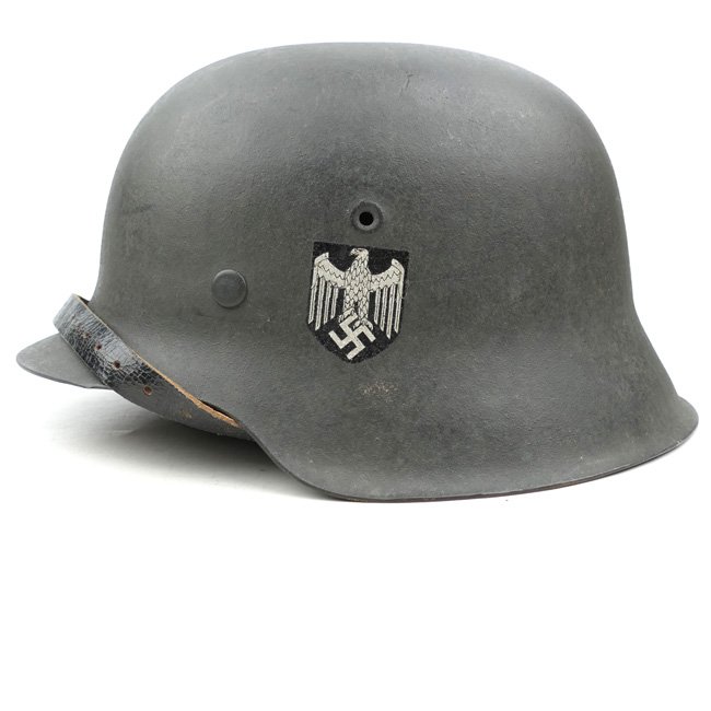 Wehrmacht (Heer) M42 Single Decal Combat Helmet (Stahlhelm M42). The stamped sheet steel construction M42 helmet retains most of its rough textured, field-grey paint. The paint shows normal wear and the left side of the helmet has a standard Heeres decal which is retained for about 95%, this is the correct pattern eagle by 'Huber Jordan u. Koerner' (aka Thin winged decal) for this maker (EF). All three liner retaining rivets are intact. The interior of the helmet has a M31 leather liner. The liner is a large size '59' and complete with original liner drawstring. The leather is in very good supple condition. The shell is marked with maker and size 'EF68' which indicates production by the company 'Emaillerwerke AG' from Fulda. The reverse interior neck guard apron has a stamped serial number, probably '3315'. The helmet is complete with its original leather chinstrap, the chinstrap is nicely maker marked and dated 1944. This helmet was taken home as a souvernir by a US GI who wrote his name on the liner 'C.J. Hoover'. Nice and honest original M42 combat helmet in very good condition!