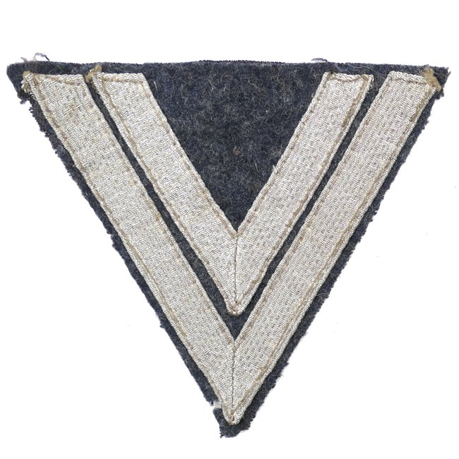 Luftwaffe Obergefreiter's Rank Chevron (Armwinkel). The Luftwaffe introduced a series of three rank chevrons on 4 March 1938 for wear by the enlisted ranks of Gefreiter, Obergefreiter and Hauptgefreiter with one chevron indicating the rank of Gefreiter, two chevrons for the rank of Obergefreiter, and three chevrons for the rank of Hauptgefreiter. These chevrons were worn on the upper left sleeve of the Service Dress tunic, the Flight blouse and the Greatcoat. The chevron is executed in grey Luftwaffe cloth and is showing two bands of silver-coloured NCO braid indicating the rank of 'Obergefreiter'. The insignia is showing a nice backing material. Nice example in very good condition!