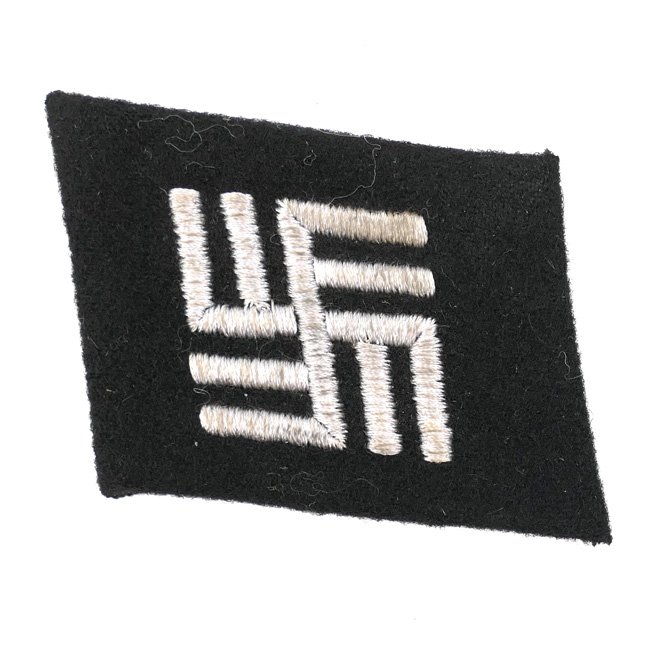 Waffen-SS Collar Tab (Kragenspiegel) as intended for Luftwaffe and Army personnel temporarily attached to Concentration Camp Duty. The collar tab is showing an embroidered double swastika in silver-grey thread on a black wool base. The collar tab is having a nice 'Buckram' backing. The collar-tab originates almost certainly from the SS clothing department at the Dachau KZ when liberated in 1945. Rare original Temporary Camp Guard collar-tab in mint and unissued condition!