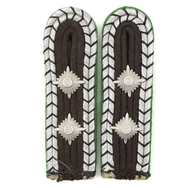Pair of 'Schutzpolizei' shoulder-boards (Schulterstücke). The police were divided into eight assorted branches of service and during the restructuring the different police agencies were assigned specific identifying 'Truppenfarbe' (Branch Colors), with the green truppenfarbe being allocated to the 'Schutzpolizei des Reichs' (National Protection Police). The German Police had no enlisted ranks with the lowest rank being an 'Unterwachtmeister' which was equivalent to the German army rank of Unteroffizier. This is a pair of 'Schutzpolizei' shoulder-boards as intended for a 'Hauptwachtmeister der Schutzpolizei'. The boards are constructed from dark brown and silver braid on a green underlay. The boards are of the sew-in type. Nice pair in good used condition!