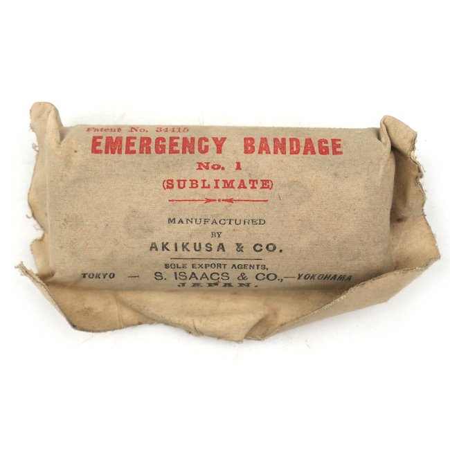 World War 1 period Japanese made Emergency Bandage, manufactured by 'Akikusa & Co' in Tokyo. These bandages were intended for export to European countries like Germany and Great Britain and also used by the German Navy. This package was just found in a house-cleaning in Germany last week. Rare original bandage package!