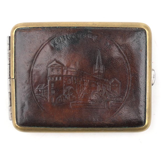 German Cigarettes Case 'Königsberg Pr.'. The pre-1945 period cigarettes case is covered with leather showing an embossed image of the Königsberg Castle. The case is nicely 'D.R.P.' marked. Rare and decorative original personal kit item!