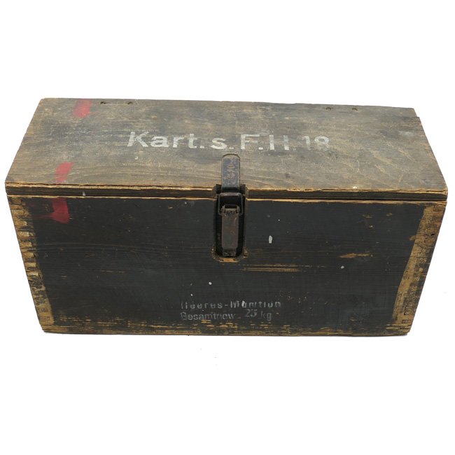 Wehrmacht 'Kart s.F.H.18' Ammunition Box (Munitionskiste), intended to hold 3 cartridges for the heavy field howitzer 18 (schwere Feldhaubitze 18). The wooden box still remains most of its original fieldgrey paint and is nicely stenciled on top with 'Kart s.F.H.18'. Original paper contents labels inside, dated 1944. The box is sized approximately 62 x 31 x 24 cms. This will be a great addition to a diorama. Decorative original ammunition box!