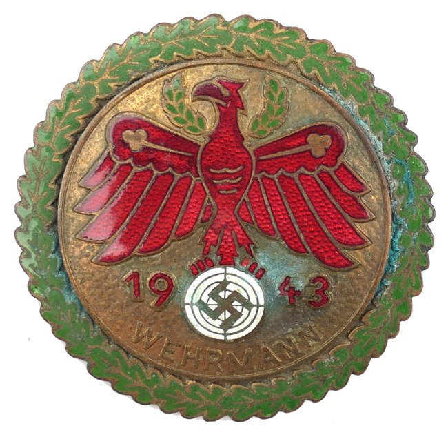 Standschützenverband Tirol-Vorarlberg 'Wehrmann' 1943 Shooting Award in Gold (Gaumeisterabzeichen in Gold mit Eichenlaubkranz). Tombak construction enameled badge, the badge is having a 52mm diameter. The badge is not visible maker marked. It comes on its original and functional pin/catch construction. Nice example in good condition!