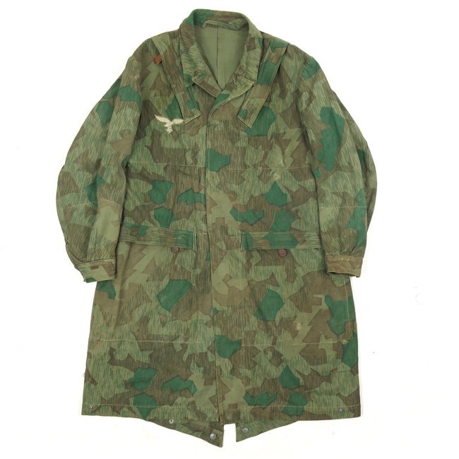 Luftwaffe 'Splittertarn' Paratrooper Smock (Fallschirmschützenbluse) also known as 'Knochensack'. The smock is made of 'Splittertarn' camouflage material. The smocks were designed to fit over the standard service uniform and are therefore quite large. It is complete with all original and functional 'Rapid' marked zippers. The smock is nicely RB.Nr. marked. The is complete with its original factory sewn breast-eagle being a rare camouflaged eagle especially designed for the FJ smocks. The smock is showing normal traces of usage/staining and some small damages, see photos for details. The smock is in overall very good condition. Hard to find desirable original Fallschirmjäger smock!