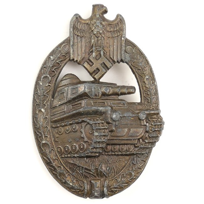 Panzer Assault Badge in Bronze (Panzerkampfabzeichen in Bronze). The Panzer Assault Badge in bronze was instituted by 'Generaloberst Walther von Brauchitsch' on '1 june 1940' for award to Panzer-Grenadier, medical, and armored car personnel who participated in three different armored assaults on three different days. This is a nice semi-hollow 'Feinzink' example which has great detail and still retains most of its original bronze finish. The badge is nicely maker marked with 'A.S.', still an unknown manufacturer from the Gablonz area, possibly 'Adolf Scholze' from Grünwald a.d. Neiße. Of course are the pin and catch fully functional. Nice and not so common example in good condition!