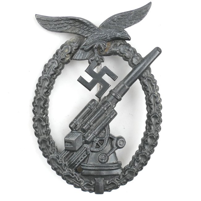 Luftwaffe Flak Artillery War Badge (Flakkampfabzeichen). The Flak Artillery War Badge was introduced by 'Reichsmarschall Hermann Göring' on 10 January 1941, for award to air defence crews including searchlight and sound detection personnel. The badge is a nice 'Zink' example which still retains some of its original silver finish. The badge is not visible maker marked. The pin and catch are complete and functional, this is the type with the so-called ball-hinge. Nice original example in good condition!