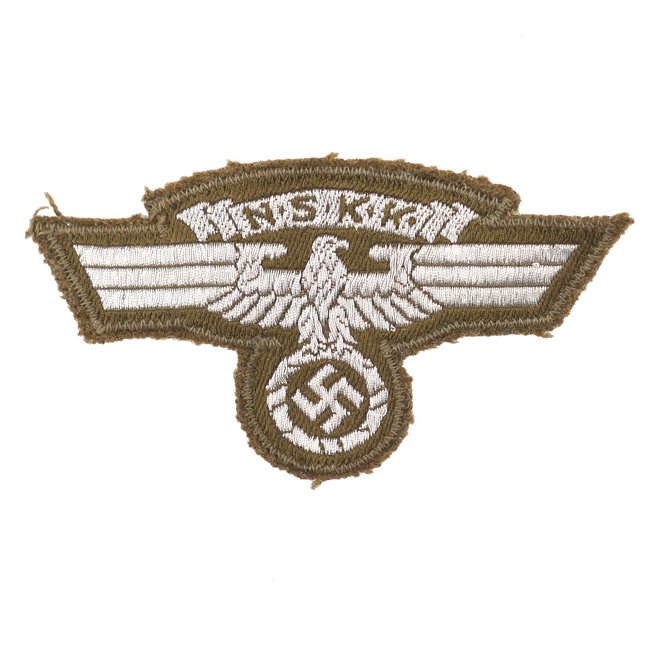 This is a very nice example of an NSKK Sleeve Eagle (Ärmeladler), as intended to be worn on the woolen service tunics. These eagles were originally worn on the upper right sleeve until late 1938 or early 1939 when it was transferred to the upper left sleeve. This example is neatly woven in so-called 'flat-wire' weave technique and mounted on a olive-brown woolen onderground. Nice example in very good condition!