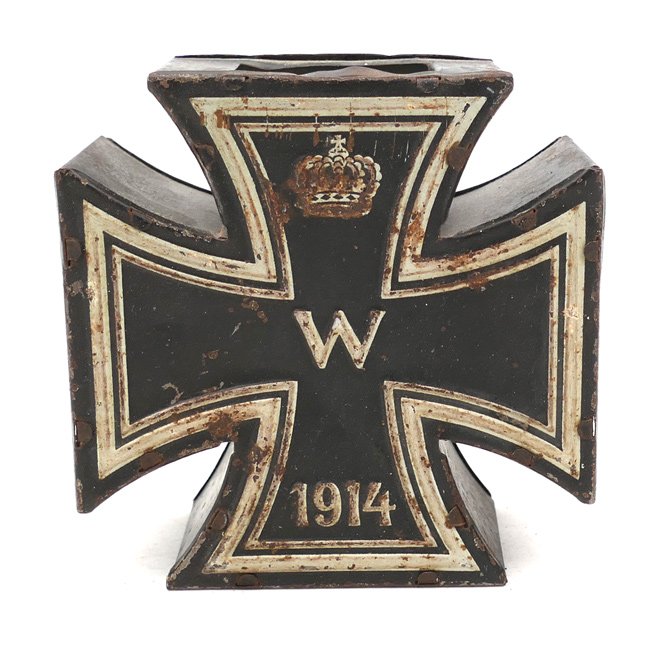 World War 1 Iron Cross Money Bank (Spardose). The sheet-metal Iron Corss 1914 shaped bank is approximately sized 9,5 x 9,5 x 4,5 cms. It is in overall very good condition showing some minor surface rust. Very decorative original piece, great for display with some iron crosses!