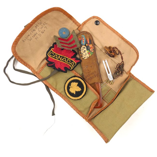 Wold War 2 Canadian Canadian Women's Army Corps (CWAC) Sewing Kit. A name and service number are written inside the flap 'M.W. Robinson, W7080 C.W.A.C.'. Complete with contents including various insignia and a nice 'Canada' marked comb in decorated leather cover.This would make a nice addition to a personal kit display of a Canadian Female service member!