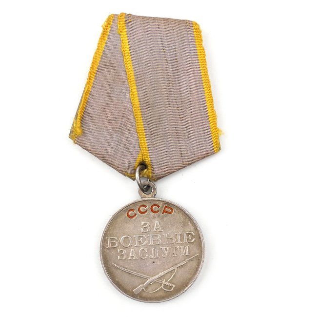 Russian Medal 'For Battle Merit' (Медаль 'За боевые заслуги') The medal was a medal of the Soviet Union established on 17 October 1938 and awarded for 'combat action resulting in a military success', 'courageous defense of the state borders', or 'successful military and political training and preparation'. The medal is complete with its original confectioned ribbon. Nice example in good used and worn condition!