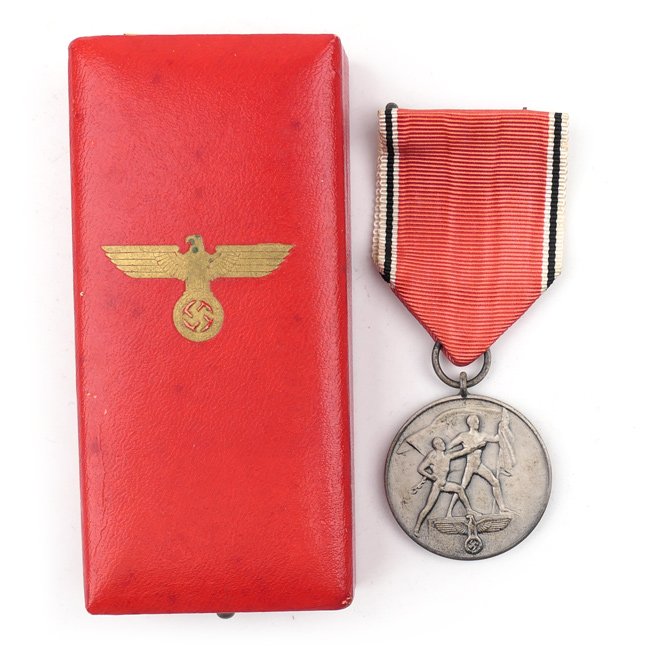 Cased Austrian Occupation Medal (Medaille zur Erinnerung an den 13 März 1938). The Commemorative Medal of 13 März 1938 was the first of the 'Anschluss' (Annexation), medal series and was instituted on 1 May 1938, for award to civilians and military personnel who participated in the annexation of Austria into Greater Germany. This is a nice example having great detail, the medal comes on its original confectioned ribbon, stored in its red coloured etui as found together. The etui is showing normal traces of usage. Nice set in good used condition!