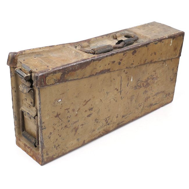 MG34 or MG42 Ammunition Box (Patronenkasten 34). The M34 ammo cases were originally developed for use with the MG34, and held up to three hundred rounds of the 7.92mm ammunition. The M34 and M41 cases were used through-out the war with minor construction variations and were adopted for use with the MG42 on its introduction. This case is a steel construction example showing a nice late war tan overpaint on top of the original fieldgrey paint. The case is showing some normalscratches caused by usage and is unfortunately missing its closure clip, see photos. The box is nicely maker marked and dated 'bsj 41' indicating production in 1941. Nice original ammo box in good used condition!