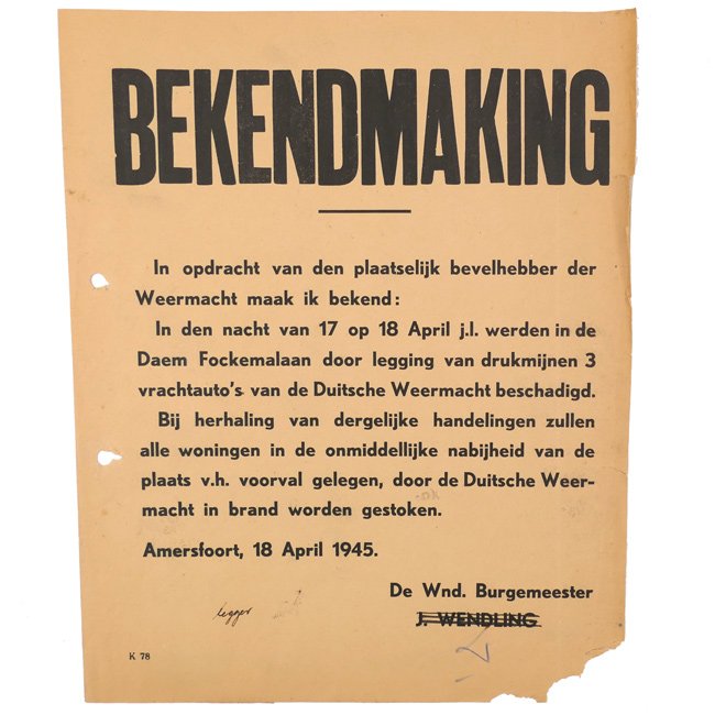 This is an original small 27 x 22 cm sized Announcement Poster (Bekendmaking) from the city of Amersfoort, dated 18 April 1945, in which the Germans threaten reprisals against acts of resistance after 3 Wehrmacht trucks are damaged in the night of April 17 to 18 in the Deam Fockemalaan by laying pressure mines, and if this is repeated, all houses in the area will be set on fire. There is some staining and small damages along the edges. Rare andecorative original late war poster in good used condition!