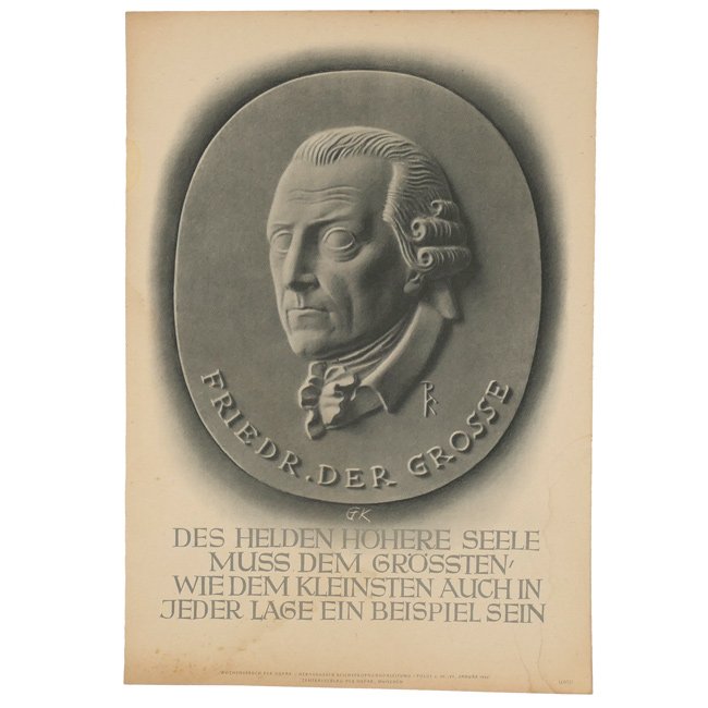 This is a nice original period paper 'Wochenspruch der NSDAP' mini poster. These posters were published weekly and this one is from the week 19/25 January 1942. The poster is showing an image of 'Friedrich der Grosse' above a quote: 'Des Helden höhere Seele muss dem Grössten, wie dem kleinsten auch in jeder lage ein Beispiel sein' (The hero's higher soul must be an example to the greatest as well as the smallest in every situation).The poster was published in order of the Reichspropagandaleitung by the 'Zentralverlag der NSDAP' from München. The postermeasures approximately 24 x 34,5 cms in size, the poster has never been folded. There is some staining and small damages along the edges. Decorative original poster in good used condition!