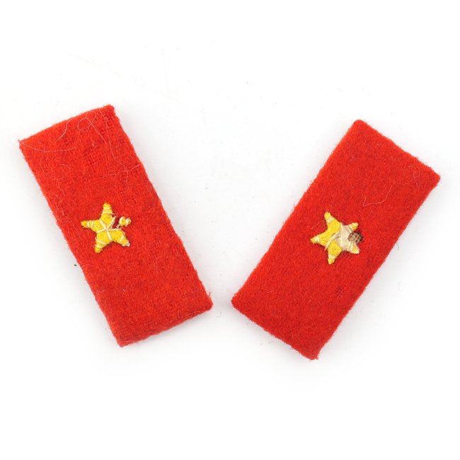 Imperial Japanese Army (IJA) WW2 Type 98 Embroidered Wool Collar Tabs Pair as intended for a Private 2nd Class. The red wool collar tabs are showing one rank star. The collar tabs are period mounted on a tan linnen backing. There is some minor moth damage. Nice original set in good used condition!