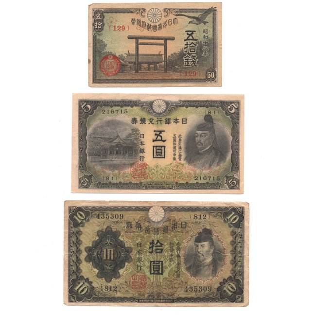 Set of 3 Japanese Banknotes. Being one banknote for 50 Sen, one banknote for 5 Yen and one banknote for 10 Yen as issued by the Great Imperial Japanese Government (大日本帝國政府). These banknotes were taken home as a souvenir by a US GI during World War 2. The banknotes are in good used condition!
