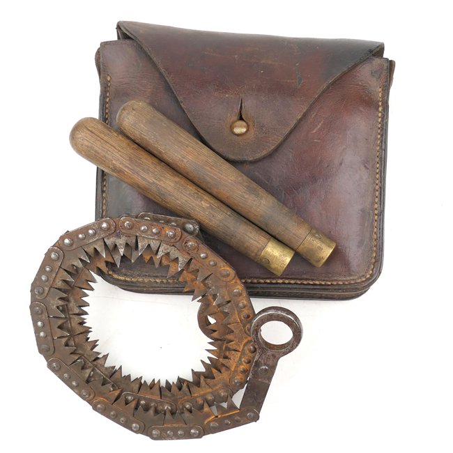 World War 1 British Folding Saw in leather pouch. Complete with wooden grips. The leather pouch is dated 1912 and is showing ink markings which indicate that it has been captured and reissued in the Imperial German Army during World War 1. Interesting original set in good used condition!