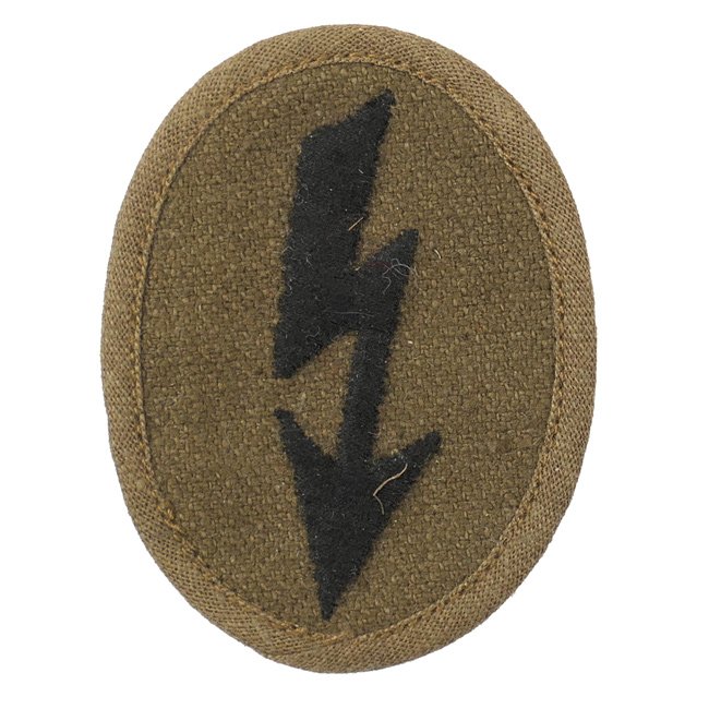 WH (Heer) Tropical Signals Personnel's Trade Badge as intended for 'Pioniere' (Tätigkeitsabzeichen für Nachrichtenpersonal). Neatly machine-embroidered black coloured lightning blitz on an oval base of light-brown tropical cloth, having a reinforced border. Worn by NCO's and privates signal personnel serving in a 'Pioniere' (Engineers) unit. A nice example in good unissued condition!