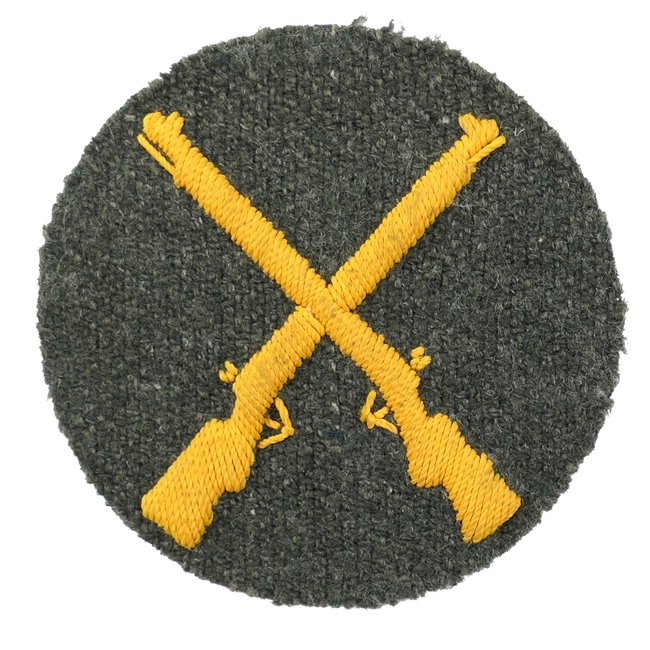 Wehrmacht (Heer) Weapons Maintenance NCO's (Unterwaffenmeister) Trade- & Special Career Badge (Tätigkeitsabzeichen). The Weapons Maintenance NCO's trade badge is neatly hand-embroidered in golden-yellow linnen on a fieldgrey wool base. Nice original example in good condition!