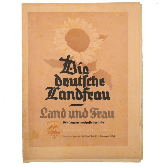 Reichsnährstand 'Die Deutsche Landfrau' Magazine. The 'Reichsnährstand' was established in September of 1933 and was responsible for controlling production, marketing, distribution and rationing of the Reich's food supply. This was a monthly published magazine, this is issue 15/16 for from 13 August 1944. The magazine is a fold-out newspaper style magazine, issued in a separate protective cover. The magazine is showing many interesting black&white photographs and illustrations. Decorative original magazine in good used condition!