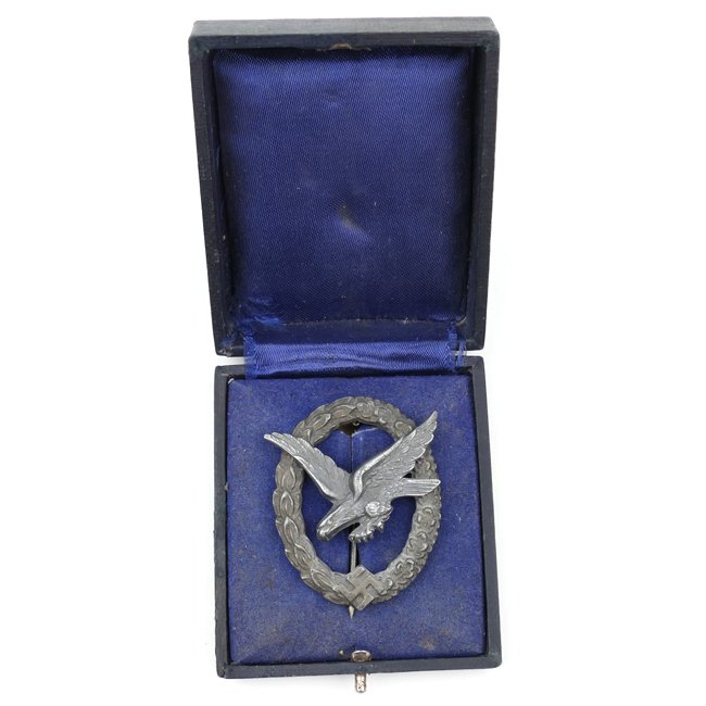 Cased Luftwaffe Air Gunner Badge (Fliegerschützenabzeichen). The Air Gunner Badge was introduced by 'Hermann Göring' on 26 March 1936 for award to radio operators, air gunners and mechanics who had met the required criteria. The Wireless Operator's/Air Gunner's badge was awarded on an individual basis and the main criteria for bestowal of the award was the completion of five operational flights over enemy territory or a minimum of two months active service. This is a late war zinc type badge, factory made without the lightning bolts as intended for airgunners only. The badge naturally has a functional pin & catch construction. The badge is nicely maker marked by the company of 'C.E. Juncker' from Berlin SW68, this is a so-called type J4. The badge comes in its matching original case as found together. The case is in good condition, on top of the case is stenciled in gilt print the script: 'Luftwaffen Fliegerschützen Abzeichen'. Great and hard to find original cased badge in good condition!